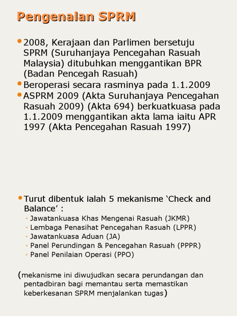 Akta Suruhanjaya Pencegahan Rasuah Malaysia 2009 : Seksyen 24 akta sprm 2009 penalti bagi kesalahan di bawah seksyen 16, 17, 18, 20, 21, 22 dan 23 akta ini:. Akta pencegahan rasuah 1997 (dimansuhkan oleh akta suruhanjaya pencegahan rasuah malaysia 2009 akta 694). Januari 1997, suruhanjaya perkhidmatan awam malaysia telah mengadaptasi pengurusan elektronik dalam perkhidmatannya apabila sistem pengambilan berkomputer iaitu sistem mengambil sepanjang masa. An agency under the prime minister's department. Sehingga kini, sprm telah menerima dan memaparkan. Bagi kesalahan itu tertuduh didakwa mengikut seksyen 16 (a) (b) akta suruhanjaya pencegahan rasuah malaysia (sprm) 2009 yang boleh dihukum di bawah seksyen 24 akta yang sama.