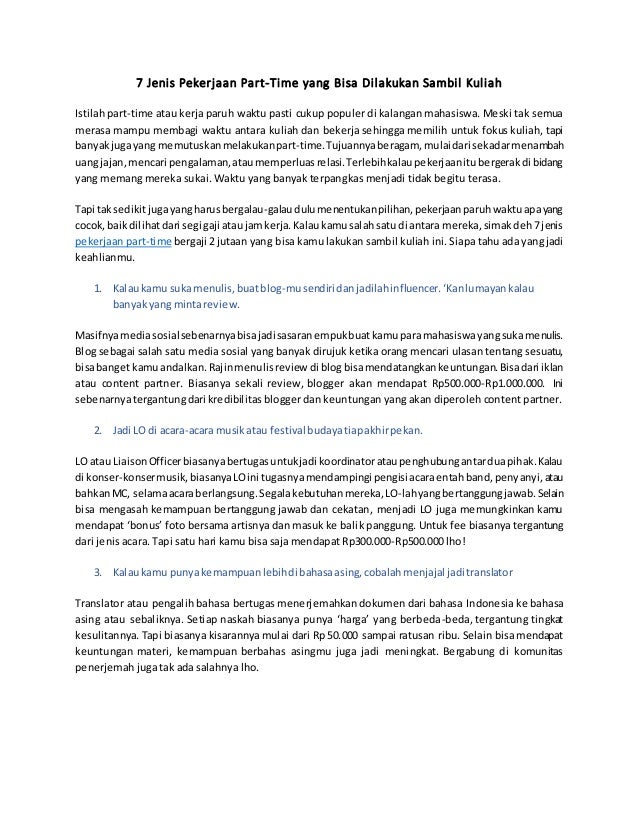 Beda dengan part time, kamu hanya bekerja maksimal 4 jam per hari tergantung kebijakan jenis kerjaan. Lalu, jangan lupa juga untuk terus mencari info baik dari kenalan atau internet. Berikut ini manfaat kerja part time yang akan kamu dapatkan antara lain; Tips mencari kerja paruh waktu. Pernah melakukan kerja part time data entry?