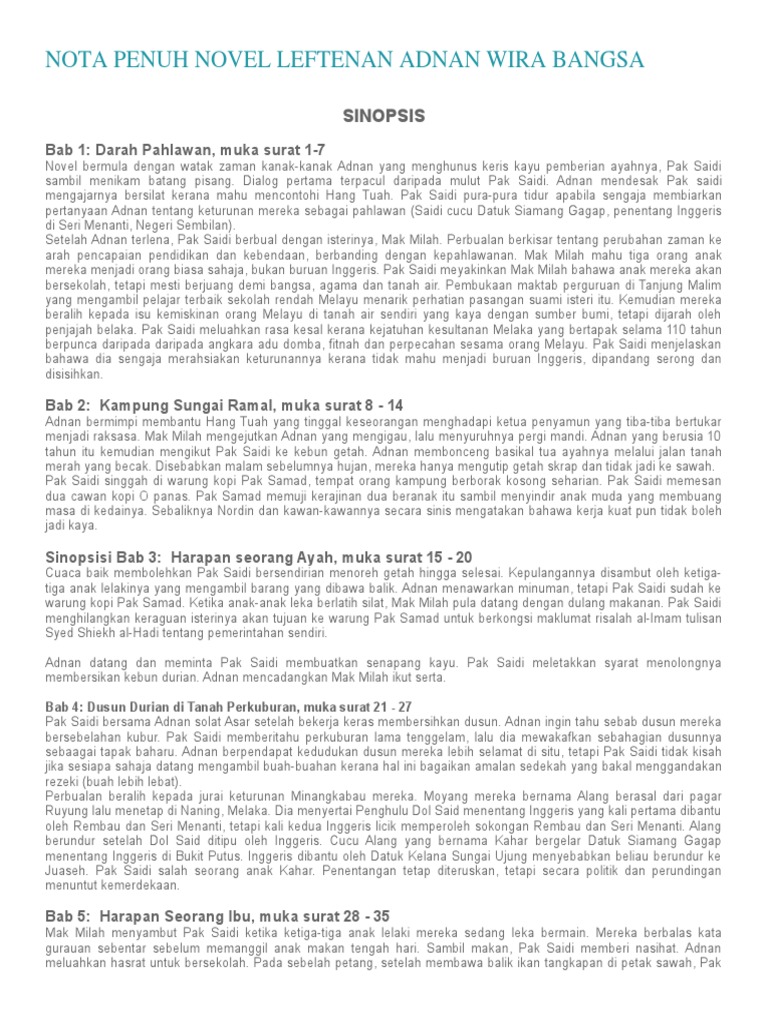 Posted on april 8, 2018 by adenium2. Pak saidi berasa amat gembira kerana dikurniakan tiga orang anak lelaki. Dia sering mendapat tempat pertama dan menjadi johan pertandingan syarahan bahasa inggeris anjuran sekolahnya. Berdasarkan novel yang saya pelajari iaitu novel leftenan adnan wira bangsa karya abdul latip bin talib, tema novel ini ialah semangat kepahlawanan askar melayu dalam mempertahankan tanah air daripada dijajah oleh orang asing. Leftenan adnan wira bangsa dimulakan dengan kisah adnan (yang masih kecil) bersama keluarganya.pak saidi berasa amat gembira kerana dikurniakan tiga orang anak lelaki. Dialog pertama terpacul daripada mulut pak saidi. Leftenan adnan wira bangsa dimulakan dengan kisah adnan (yang masih kecil) bersama keluarganya. Novel yang saya kaji ialah leftenan adnan karya abdul latip. Sinopsis bab demi bab, tema, persoalan, watak dan perwatakan, latar masa, latar tempat, latar masyarakat, plot, teknik penceritaan, nilai, pengajaran, soalan peperiksaan + skema jawapan, contoh soalan + jawapan : Leftenan adnan telah bertempur dengan tentera jepun di sini. Start studying novel leftenan adnan. Novel leftnan adnan wira bangsa : Akhirnya adnan menjadi juara, ah chong mendapat tempat kedua manakala nizam mendapat tempat ketiga.