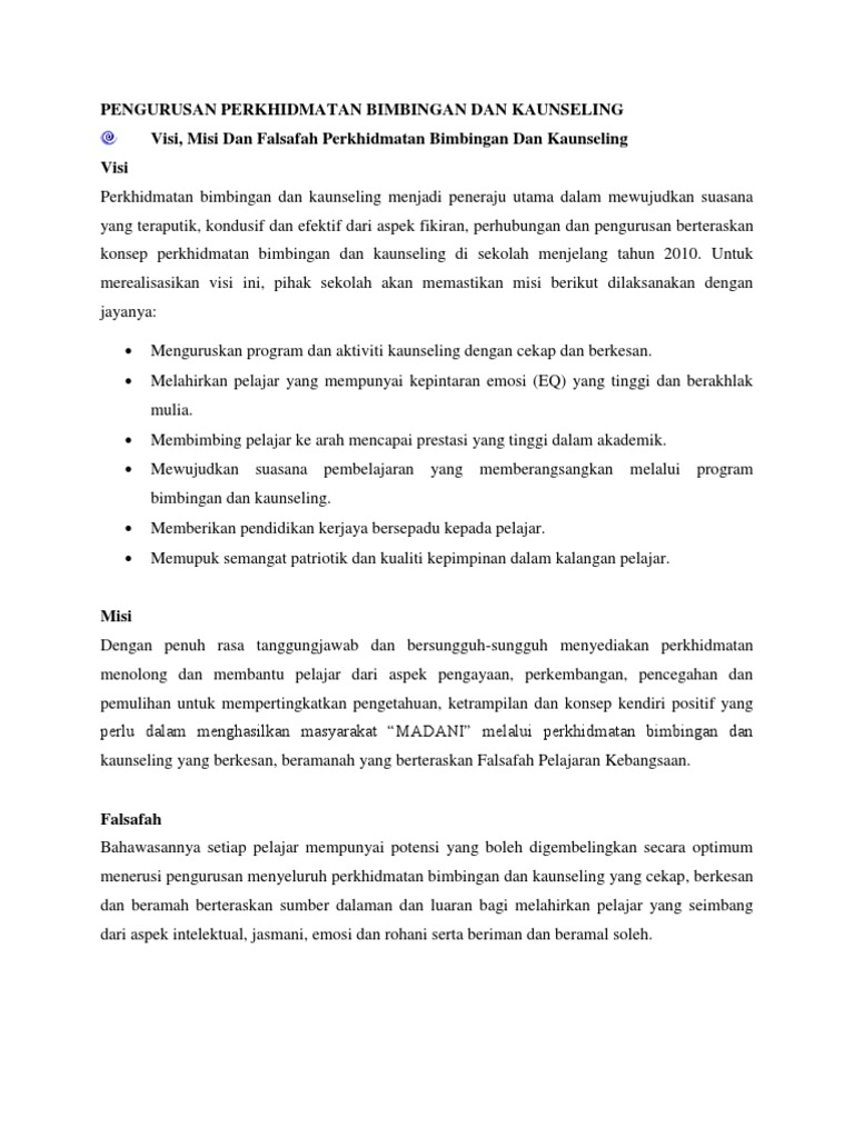 Penilaian dalam perkhidmatan bimbingan dan kaunseling (2) from image.slidesharecdn.com Alasannya karena bimbingan konseling menjadi sebagai pendamping peserta didik (murid). Perkhidmatan inventori individu dan rekod. Di dalam pendidikan bimbingan dan konseling mewakili hasrat masyarakat untuk membantu individu. Bimbingan dan konseling merupakan suatu kebutuhan yang terpenting untuk menuntun individu didalam kehidupan. Kata guindance berasal dari kata kerja to guide yang mempunyai arti menunjukan, membimbing, menuntun, ataupun membantu (hallen 2005:2). L'etude est realisee a l'aide d'un m.f.a. Normah binti zakaria pensyarah kursus bimbingan dan kaunseling cameraman : Lepas upsr ke mana nak ditempatkan.